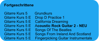 Fortgeschrittene  Gitarre Kurs 5       Grundkurs Gitarre Kurs 5 E    Drop D Practice 1 Gitarre Kurs 5 E    California Dreaming Gitarre Kurs 5 E    Acoustic Rock Guitar 2 - NEU Gitarre Kurs 5 E    Songs Of The Beatles Gitarre Kurs 5 E    Songs From Ireland And Scotland Gitarre Kurs 5 E    Fingerpicking Guitar Instrumentals Fortgeschrittene Anfänger  Gitarre Kurs 3       Grundkurs Gitarre Kurs 3 E    Summertime Gitarre Kurs 3 E    Best Of Summertime Gitarre Kurs 3 E    Classic Blues 1 Gitarre Kurs 3 E    Made In Germany 1 Gitarre Kurs 3 E    Single Notes And Melody - NEU Gitarre Kurs 3 E    Blues Guitar Instrumentals 1 Fortgeschrittene Anfänger (Beginn des Barréspiels)  Gitarre Kurs 4       Grundkurs Gitarre Kurs 4 E    Beat Booster Gitarre Kurs 4 E    Classic Blues 2 Gitarre Kurs 4 E    Made In Germany 2 Gitarre Kurs 4 E    Blues Guitar Instrumentals 2 Gitarre Kurs 4 E    Acoustic Rock Guitar - NEU Gitarre Kurs 4 E    Single Notes And Melody 2 - NEU Erfahrene Spieler  Gitarre Kurs 6       Grundkurs Gitarre Kurs 6 E    Drop D Practice 2 Gitarre Kurs 6 E    Flatpicking Guitar 1 Gitarre Kurs 6 E    Flatpicking Guitar 2 Gitarre Kurs 6 E    Fingerpicking Guitar Instrumentals 2